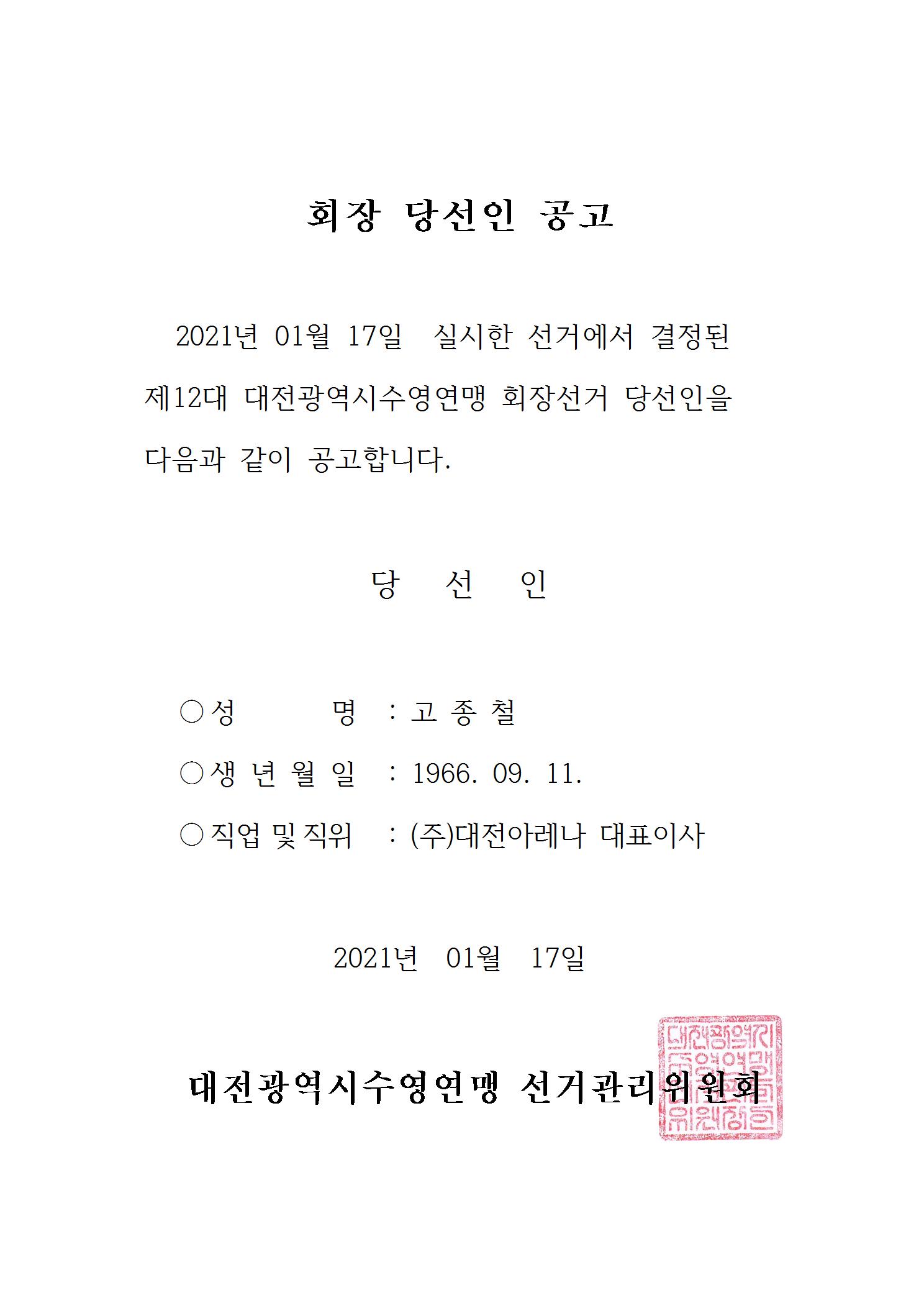 Á¦¸ñ Á¦12´ë ´ëÀü±¤¿ª½Ã¼ö¿µ¿¬¸Í ȸÀå¼±°Å ´ç¼±ÀÎ °ø°í