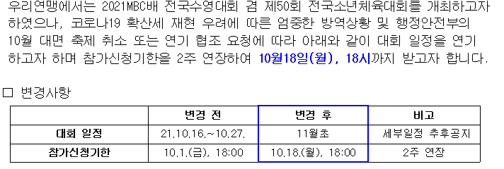 2021 MBC¹è Àü±¹¼ö¿µ´ëȸ °â Á¦50ȸ Àü±¹¼Ò³âüÀ°´ëȸ°¡ ¿¬±âµÇ¾î ¾Æ·¡¿Í °°ÀÌ ¾È³» µå¸³´Ï´Ù.