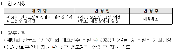 Äڷγª19 È®»ê ¹æÁö ¹× Á¦50ȸ Àü±¹¼Ò³âüÀ°´ëȸ Á¾¸ñº° °âÀÓ´ëȸ ÀϺΠÁ¾¸ñ(10Á¾¸ñ) ¹ÌÁ¾·á µîÀÇ »çÀ¯·Î Á¦51ȸ Àü±¹¼Ò³âüÀ°´ëȸ ´ëÀü±¤¿ª½Ã ´ëÇ¥¼±¼ö Æò°¡ÀüÀº °³ÃÖµÇÁö ¾ÊÀ½À» ¾Ë·Áµå¸³´Ï´Ù.