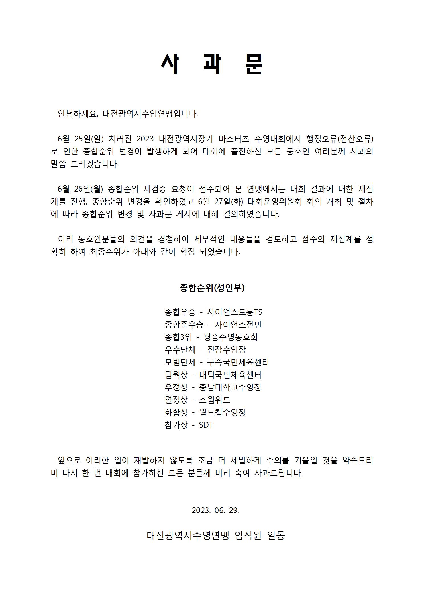 Á¦¸ñ 2023 ´ëÀü±¤¿ª½ÃÀå±â ¸¶½ºÅÍÁî ¼ö¿µ´ëȸ »ç°ú¹® ¹× Á¾ÇÕ¼øÀ§ º¯°æ °øÁö