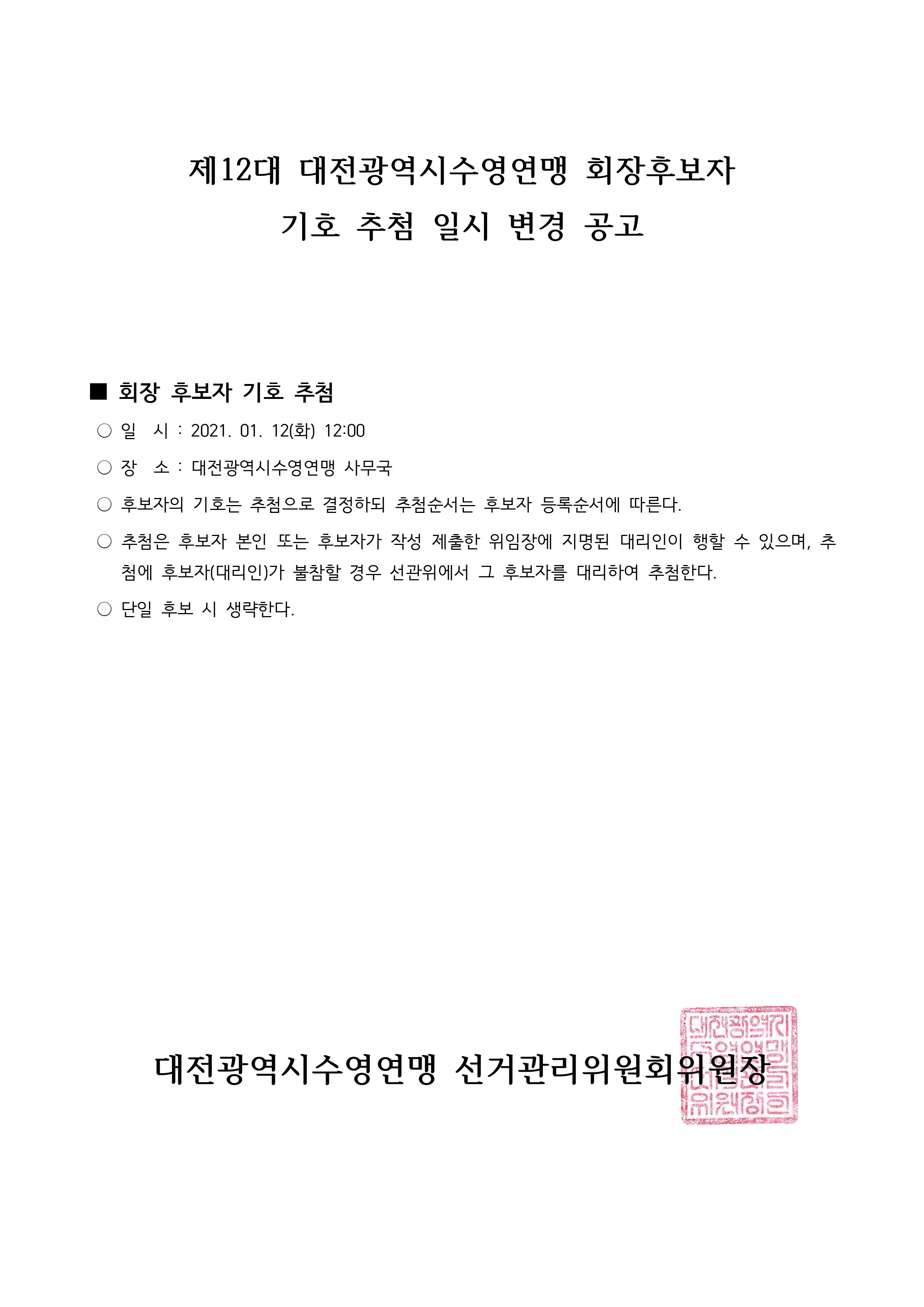 제12대 대전광역시수영연맹 회장후보자 기호 추첨 변경 공고 .pdf